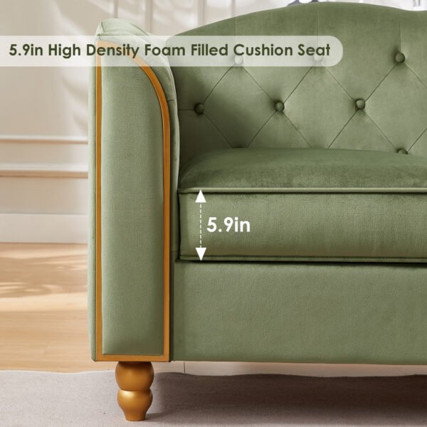 It is made of high-quality wood and rests on solid wooden legs in golden color. This large upholstered sofa is wrapped in velvet , soft and skin-friendly engineered fabric, and a seat cushion filled with high-elastic foam, which provides comfortable support for your body when sitting and easily recovers its shape when you stand up. The sturdy wood legs allow the sofa couch to easily support 800 pounds of weight, adding stabili