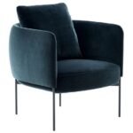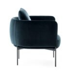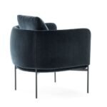 Club chair by DNF has a graphic appearance that results from the combination of sleek, black metal legs and curved shell with cotton upholstery. A fluffy back cushion adds a relaxed touch to the chair.
