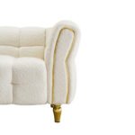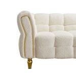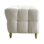 on 4 pieces of golden metal legs. A boucle fabric with a tufted, grid- like motif wraps this couch in plenty of texture. The sinuous springs and foam filled offer lots of support when you rest on the sofa. This sofa features stitched detail and gleaming decor strip of flared arms.